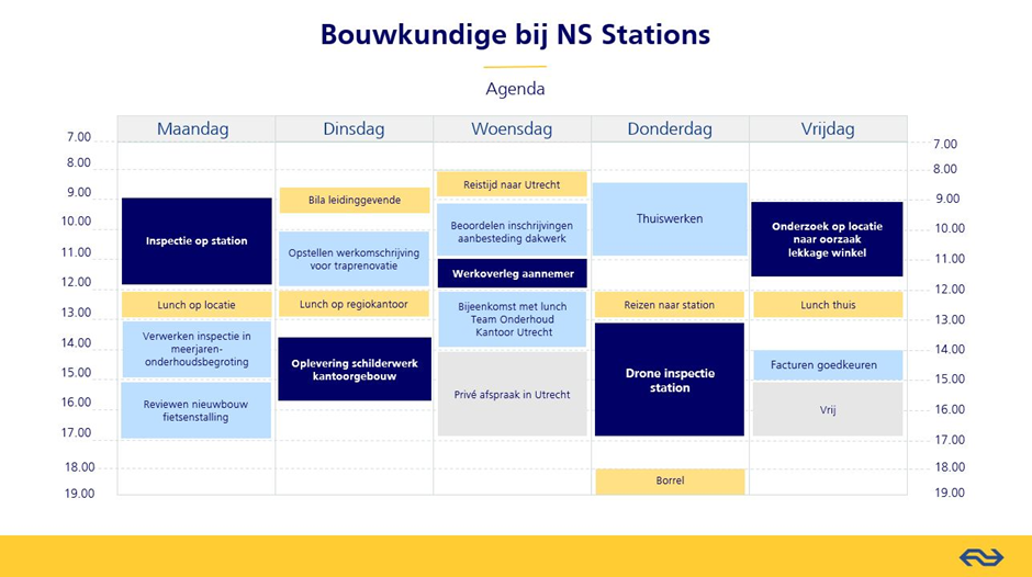 Benieuwd hoe je werkweek eruit kan zien? Voorop gesteld is echt elke week anders! Je bent regelmatig op pad langs stations in de regio Eindhoven, werkt samen met collega’s, aannemers en opdrachtgevers en pakt afwisselende bouwkundige vraagstukken op. Je vertaalt je inspecties en adviezen naar concrete plannen en zorgt ervoor dat het vastgoed van NS toekomstbestendig blijft.